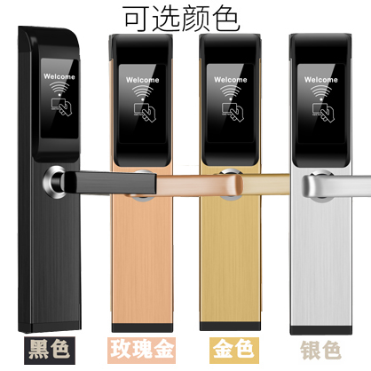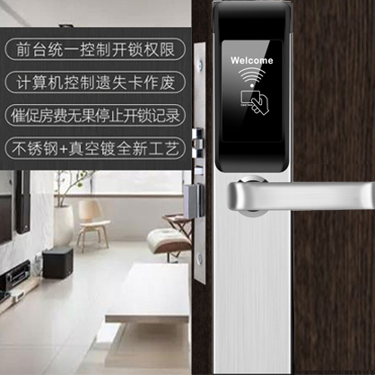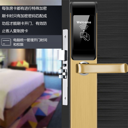 不锈钢材质+304不锈钢锁体,后背外置电池盒,使用寿命长。使用加密T5577专用卡,拒绝复制,安全性更高。隐藏式钥匙孔,全铜锁芯,安全美观,紧急情况用钥匙开锁。室内开启反锁功能(反锁旋钮),室外刷卡无法开锁,客人拥有安全的空间。