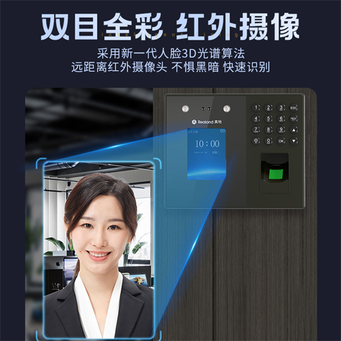 1.采用新一代人脸3D光谱算法远距离红外摄像头 不惧黑暗,秒速打卡,支持人脸/掌纹/指纹/刷卡/密码考勤;