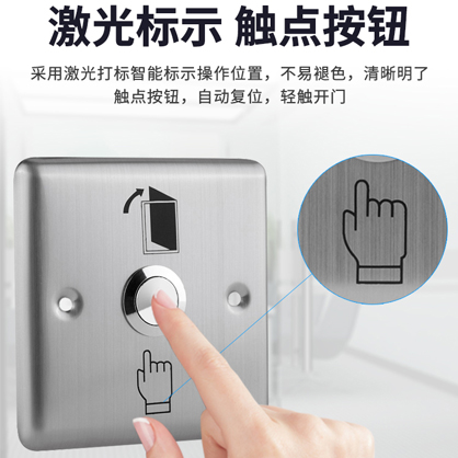 真地K6不锈钢门禁开关,表面防水,美观耐用,触点按钮,耐高温,可配标准86底壳;不锈钢材质,防火阻燃,美观耐用,表面防水,产品稳定使用时间长;激光打标智能标示操作位置,不易褪色,清晰明了。