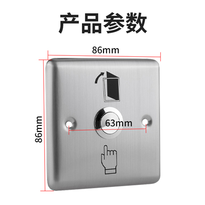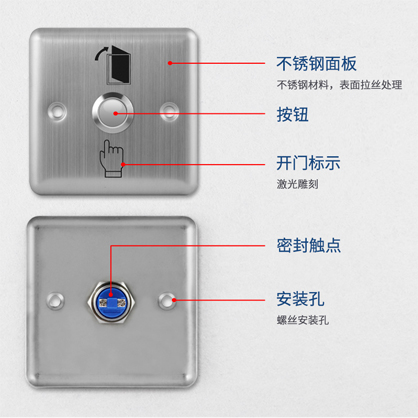 触点按钮,自动复位,轻触开门。背面采用密封双触点设计,抗老化能力强,产品性能稳定,使用更安全;全金属外壳,表面防水,适用于庭院/小区/别墅/企业等门禁系统使用。
