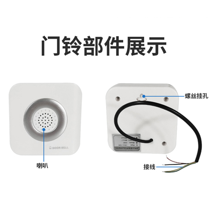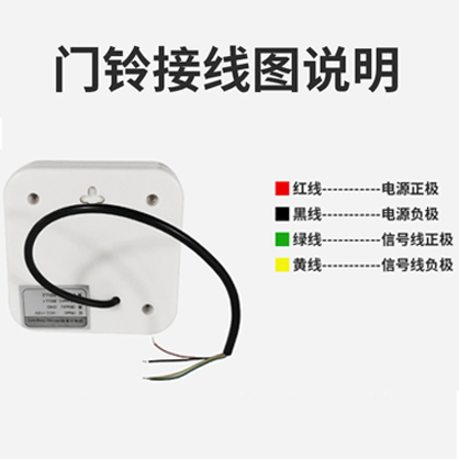 提示:产品接入门禁系统后,按下门铃按钮即可发出悦耳叮咚声,红线接正极、黑色接负极,绿色黄色分别为信号线