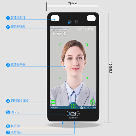 5寸IPS全视角高清显示屏,支持触屏管理,支持照片下发注册;支持BS,CS架构软件,手机APP管理;2万用户数据容量,支持人脸、刷卡、密码认证,支持TCP/IP通讯(可定制WIFI),支持二次开发,提供OEM,ODM;支持OTA升级与U盘插入升级,让设备通过不断升级,提升功能价值。