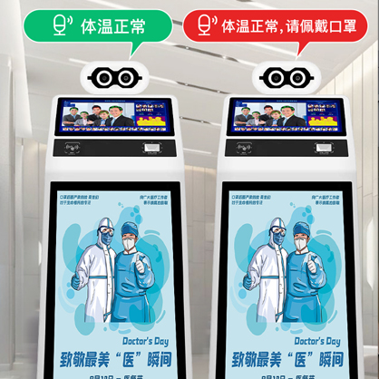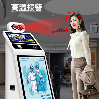 支持检测人员有无佩戴口罩,检测到未佩戴口罩人员,机器人自动语音警报,加强防控管理;自带15.6英寸触摸显示屏,触控灵敏,自动显示实时画面,不用外接显示屏,通电即用;自带27英寸高清广告屏,画质清晰,U盘上传广告,屏幕自动显示画面;配有智慧测温管理软件,局域网获取、储存并统计分析数据,一目了然。